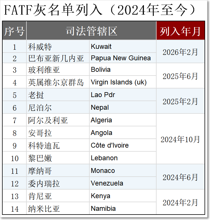 2026年2月13日,国际反洗钱反恐怖融资权威组织FATF(Financial Action Task Force on Money Laundering,金融行动特别工作组)通过官网公布最新一期名单。其中: