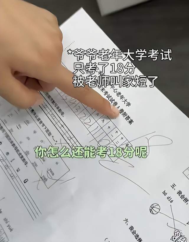 有网友的爷爷期末考试,只考了18分,他被请到学校,站在老师身旁继续“装孙子”。